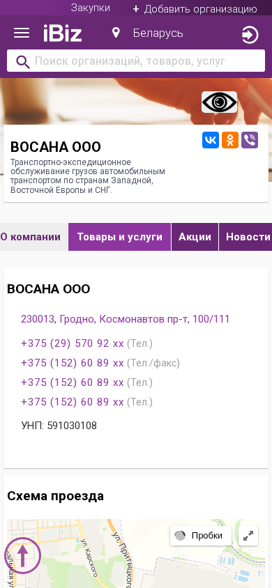 | Название / Заголовок | ВОСАНА ООО - Транспортно-экспедиционное обслуживание грузов автомобильным транспортом по странам Западной, Восточной Европы и СНГ.. 230013, Гродно, , Космонавтов пр-т, 100/111 |