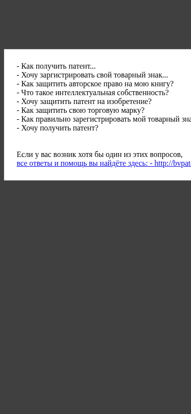 | SEO-лексика | знак патент товарный хочу защитить зарегистрировать изобретение получить торговый консультации заргистрировать свой авторское право мою книгу такое интеллектуальная собственноcть свою |
