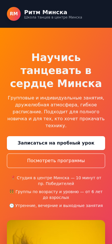 | AI-анализ | This online resource is a dance school website named "Ритм Минска" (Rhythm Minsk) located in the center of Minsk. It offers group and individual dance lessons for adults and children, including hip-hop, latina, bachata, ballroom, and contemporary styles. The website provides a flexible schedule, with morning, evening, and weekend classes available. Prospective students can register online for a trial lesson and view the program offerings. The studio is 10 minutes from Prospekt Pobediteley and offers classes for all ages and skill levels. Students can choose from various dance genres, such as hip-hop and street dance, latin (salsa and bachata), ballroom (waltz, tango, and bachata-styling), and contemporary dance and stretching. The website also features experienced dance instructors, individualized instruction, |
