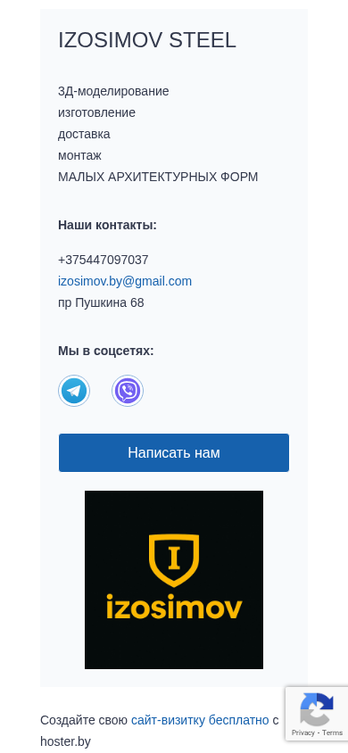 | SEO-лексика | izosimov проверьте корректность введ нного поля steel сообщение 3д-моделирование изготовление доставка монтаж малых архитектурных форм наши контакты 375447097037 gmail com |