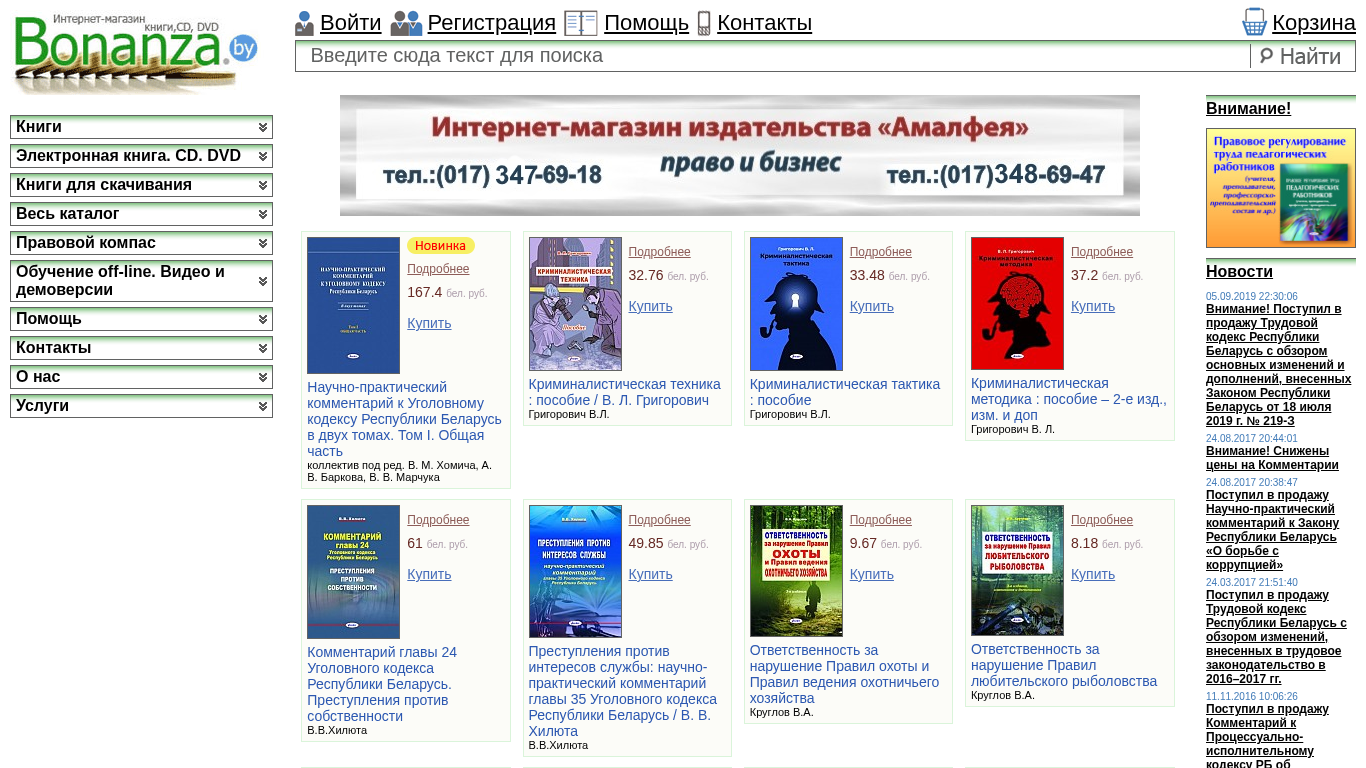 | AI-анализ | --- The website Bonanza.by is an online bookstore and educational resource, primarily selling digital and physical books related to law and criminal justice. The website's title is "Bonanza" and its description includes keywords such as "подробнее" (detailed), "бел" (Belarus), "руб" (Belarusian ruble), "купить" (buy), "беларусь" (Belarus), and various legal terms. The most frequently used words on the site include "подробнее" (53 occurrences), "бел" (53), "руб" (53), and "купить" (53). The site offers a variety of legal texts and study materials, including commentaries on the Belarusian Criminal Code, criminal tactics and methodologies, and administrative law. Prices range from 8 |