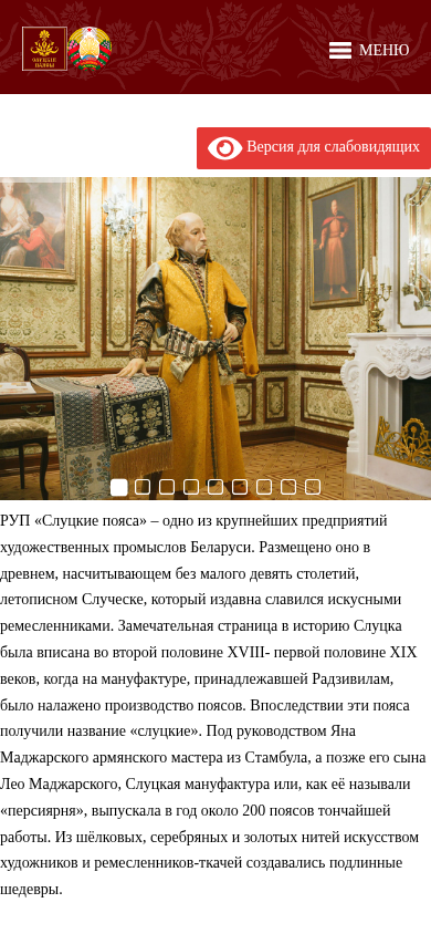 | AI-анализ | This website is the official one for RUP "Sluцкие Пояса" (Sluцkiе Poяса in English), a prominent artistic craft business in Belarus. The title reflects the company name, and the description includes various keywords related to textile products, national clothing, and souvenir items. The top_words reveal frequent mentions of 'комплекты' (sets or collections), 'пояса' (belts), 'сувенирные' (souvenir) items, 'продукция' (products), and 'одежда' (clothing). The menu reveals sections on the company, awards, media, production, and commissions against corruption. The site offers a variety of swedish and national textile items, including tablecloths, bedding, and tableware sets with embroidery. There are also sections for sou |