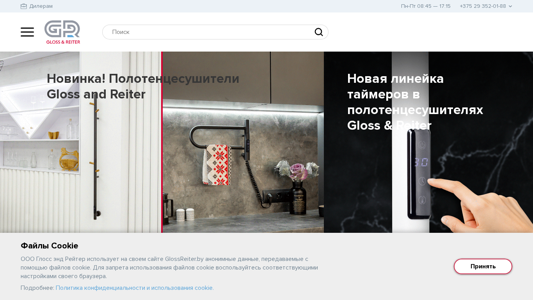| SEO-описание | Интернет-магазин полотенцесушителей Gloss & Reiter: официальный сайт производителя белорусских водяных и электрических полотенцесушителей |