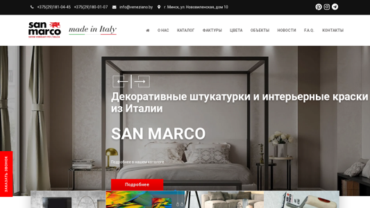 | SEO-описание | Декоративные штукатурки и краски San Marco из Италии. Элегантность, гармония, цветовая гамма для выражения ваших эмоций и творческих замыслов! Купить венецианскую штукатурка в магазин-салоне в Минске. |
