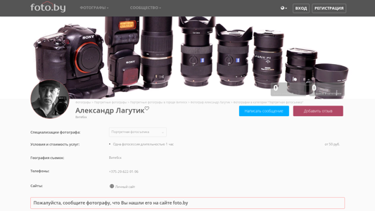 | AI-анализ | The website of photographer Alexander Lagutik from Vitsebsk, Belarus. It specializes in portrait photography. The main page displays a catalog of photographers, with Alexander Lagutik listed under the "Portrait photographers" category in the city of Vitsebsk. The website includes information on the photographer's specializations, pricing, and contact details. The photographer's portfolio is also accessible on the site. |