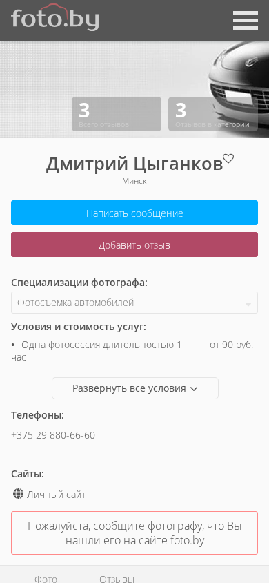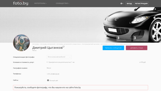 | AI-анализ | This online resource is a photography website belonging to Dmitry Tsiganok, a photographer based in Minsk, Belarus. The website features a category dedicated to automobile photography. The photographer works as an automobile photographer in Minsk. The website also includes a community of photographers with various sections for different types of photography and services. The user interface allows users to browse through different categories, view portfolios, read reviews, and contact photographers directly. The website offers a personal site for Dmitry Tsiganok, where users can view his automobile photography works, prices, and contact information. The main categories of photography on the website include but are not limited to: animals, architecture, children, aerial photography, maternity, graduation, corporate, wedding, family, food, love stories, and reviews of photographers. Users can also find information about equipment, contests, and blogs. |