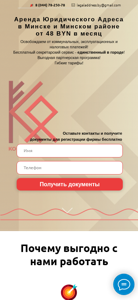 | AI-анализ | This online resource is a legal address rental service, based in Minsk and the Minsk region of Belarus. It guarantees full registration for new clients, offering a unique service in the city. The website provides clients with offices to use, free of communal, exploitation, and tax payments. Clients also receive a free secretarial service, which is the only one in the city. The tariffs are flexible, starting from 48 BYN per month for a legal address rental in Minsk and the Minsk region. The website offers a form for clients to leave their contact information and receive the necessary documents for company registration for free. The website also mentions a partnership program and a contact number and email address for inquiries. The top words on the website are 'address', 'adresu', 'vas', 'юридического', 'адреса', 'офи |