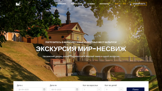 | AI-анализ | The web project "Mir-Nesvizh.by" offers guided tours to two famous castles in Belarus: Mir and Nesvizh. Regular excursions depart from the train station in Minsk. Experienced guides and comfortable transportation are provided, along with an included lunch. |