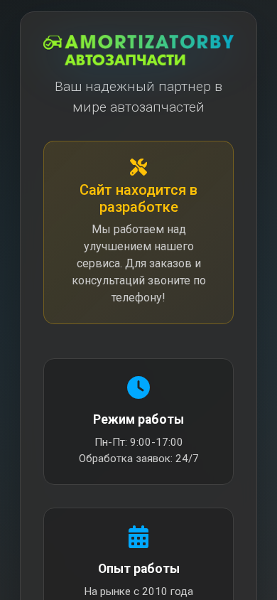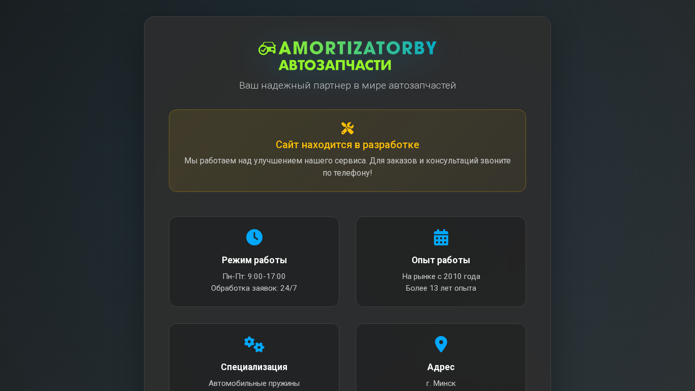 AI-анализ | --- This website, Amortizator.by, offers a wide range of automobile springs for suspensions in Minsk. Available are reinforced, front, and rear springs at affordable prices. The business has been operating since 2010. Keywords associated with the site include 'reinforced springs', 'front springs', 'rear springs', 'buy springs Minsk', 'automobile springs', 'springs for suspension', 'reinforced springs for shock absorber', and 'amortizator'. The site, which is under development, focuses on improving its service. For inquiries and consultations, call the phone number provided. The business operates from Monday to Friday, 9:00-17:00, with 24/7 order processing. With over 13 years of experience in the market, the specialty |