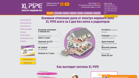| AI-анализ | This online resource is dedicated to selling and installing electro-hydronic floor heating systems called XL PIPE in various cities across Belarus, including but not limited to: Minsk, Baranovich, Bobruisk, Borisov, Brest, Vitsebsk, Homel, Hrodna, Zhilin, Lida, Mohyliv, Mozir, Novopolotsk, Orsha, and Pinsk. The website provides information on the benefits of XL PIPE systems, such as quick installation within 3 days without a boiler or radiators, lower capital costs, energy savings of up to 20%, and no maintenance required. The system consists of a polyethylene pipe with a diameter of 20mm, containing liquid and a heating cable inside. It comes in nine lengths from 7 to 84 meters and can heat a space from |