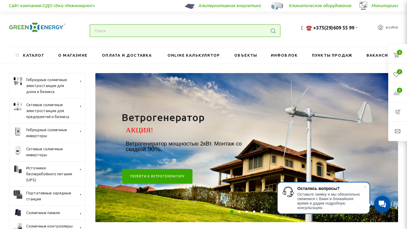 | SEO-описание | Альтернативная энергетика - солнечные батареи, ветрогенераторы, солнечные инверторы, аккумуляторы купить в интернет-магазине https://green-energy.by/ |