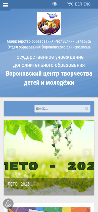 | AI-анализ | --- This online resource is the official website for the Вороновский центр творчества детей и молодёжи (Voronovo Center for Children and Youth Creativity), located in the city of Voronovo, Grodненskaya oblast, Belarus. The site provides information about the center's activities, including educational projects, camps, and various competitions. Notable events include the "Поезд памяти" (Memory Train) project commemorating the 80th anniversary of the Victory in the Great Patriotic War, and the "КВН «В будущее с улыбкой»" (Laughter in the Future KVN) and "ТехноЕлка" (Technical Christmas Tree) competitions. The site also features news about the district, region, and education sector, as well as archived news |