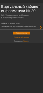 | AI-анализ | The portal is a virtual cabinet for the Informatics Department of Middle School No. 10 named after V.I.Pelenicyna in Sloнима, Belarus. The website was moved to a new location <http://informatic-6-online.tilda.ws/> on a Saturday, the 27th of April, 2024. The main page can be opened using the link "Open web version" on the blogspot domain <sh10inf.blogspot.com.by>. The website utilizes Blogger technology. |