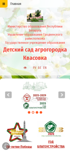 | AI-анализ | --- The web project "Детский сад агрогородка Квасовка" (Kvasovka Kindergarten) is a part of the educational system in Belarus, under the Ministry of Education of the Republic of Belarus, Grodno Oblast, and Grodno Regional Executive Committee. The kindergarten is a state educational institution located in the village of Kvasovka, with the address Per. Pervoi Mai, 15. The contact details provided include a phone number +375 152 68-32-97 and an email address kvasovka.sad@grodno-region.by. The website offers information about the kindergarten's management, news, pedagogical staff, anti-corruption measures, visit card, structure, admission process, photo gallery, trade union, occupational safety, |