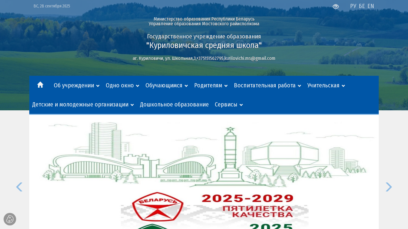| AI-анализ | The web project "Куриловичская средняя школа" (Kurilovichskaya Srednyaya Shkola, Kurilovichi Middle School) provides information about a state educational institution located in the village of Kurilovichi, under the Moстовsky district of Belarus. The website includes sections on the school's organization, news, visiting card, licensing information, work schedule, photo gallery, admission procedures, faculty, paid services, certificates, an information and bibliographic center, history, informatization, goals and tasks, normative basis, information security, one-window service, contacts, and work with personal data. The school offers information on emergency services, hotlines, and various events, including open days and targeted admissions in 2025. The website also provides details on applying to universities in Belarus. The domain is kuril.room |