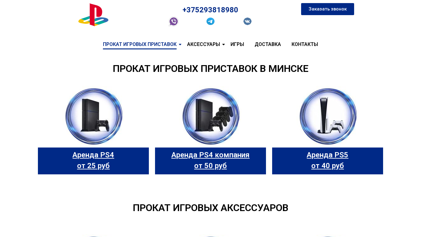 | AI-анализ | --- The website is titled "ПРОКАТ ИГРОВЫХ ПРИСТАВОК - Аренда игровых консолей в Минске" (Rental of gaming consoles in Minsk). It offers rental services for PlayStation 4 consoles with delivery to your door within a day for a low price. The phone number for inquiries or orders is +375293818980. The website includes offerings for PlayStation 5 consoles, accessories for PlayStation VR and PS4, gamepads, and the combination of PlayStation 4 and VR. The site also offers a list of available games for rent. Customers in Minsk can easily rent gaming consoles, accessories, and games with the convenient home delivery service. The process of renting PlayStation 4 or 5 cons |