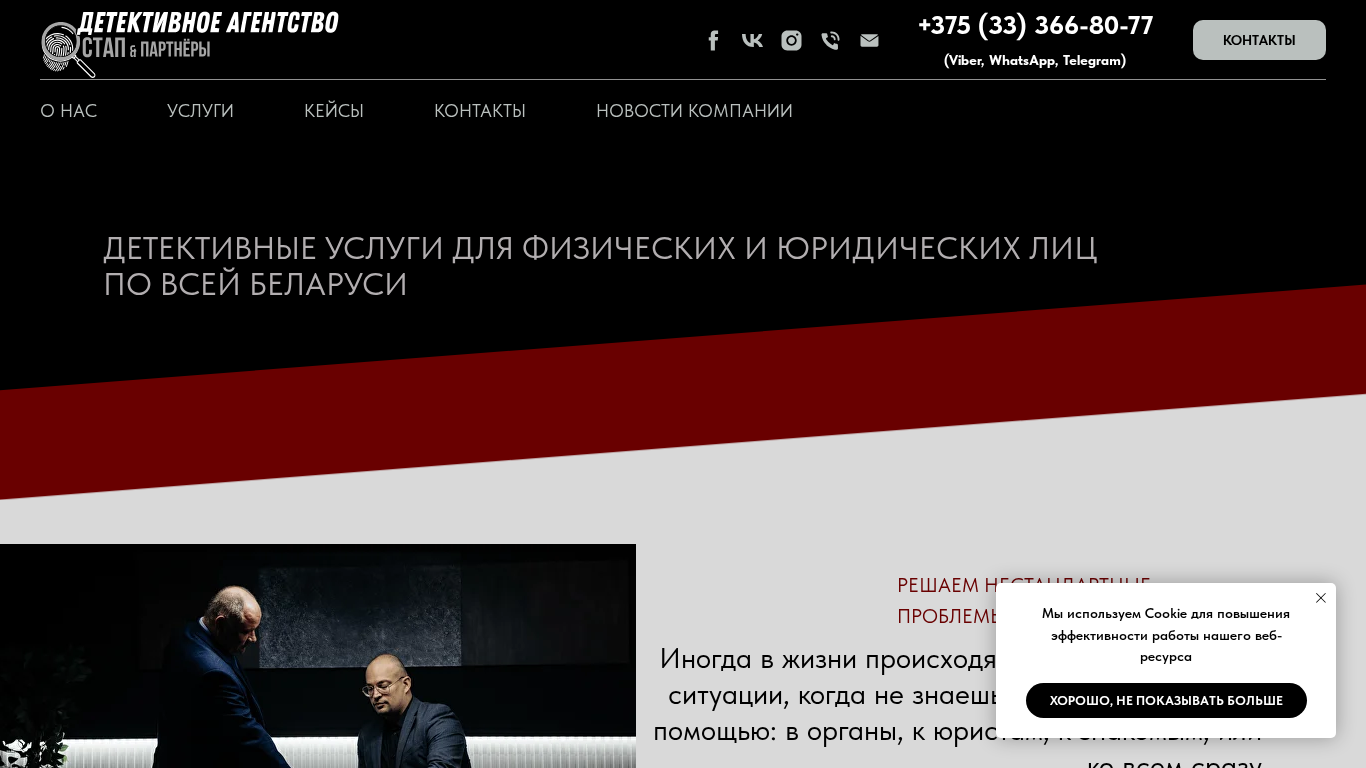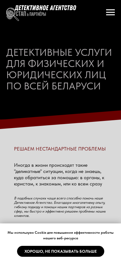 | AI-анализ | language: ru country_code: BY The web project "Detective Agency 'Ostap and Partners'" offers investigative services for both physical and legal entities throughout Belarus. When dealing with delicate situations where it is unclear who to turn to - be it to the authorities, lawyers, acquaintances, or all at once, our Detective Agency is often the best solution. With extensive experience, a flexible approach, and the support of our partners from various fields, we efficiently and effectively tackle our clients' challenges. We are committed to honoring our contracts and, if we fail to deliver the desired results, we return the funds, deducting only our minimal expenses. We maintain complete confidentiality throughout the entire process to ensure our clients' peace of mind. Our services are officially contracted and we operate within the framework of Belarusian legislation. We only take on cases that we can solve. Our |
