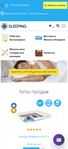 | AI-анализ | --- The web project Sleeping.by is an e-commerce platform based in Minsk, Belarus, selling orthopedic mattresses, beds, children's beds, and growing furniture. Customers can purchase products from the manufacturer with delivery available throughout Belarus. The website offers mattresses and beds at various firmness levels and heights, with a range of options including pronguish, memory foam, and latex mattresses. Additionally, the site provides a catalog of other furniture items for the home. The contact information includes phone numbers and a form to request a call back. The working hours are listed as 09:00 - 21:00, seven days a week. The site features a reviews section, news, and product comparisons. The catalog includes various categories such as pronguish, memory foam, children's, and premium mattresses, as well as various |