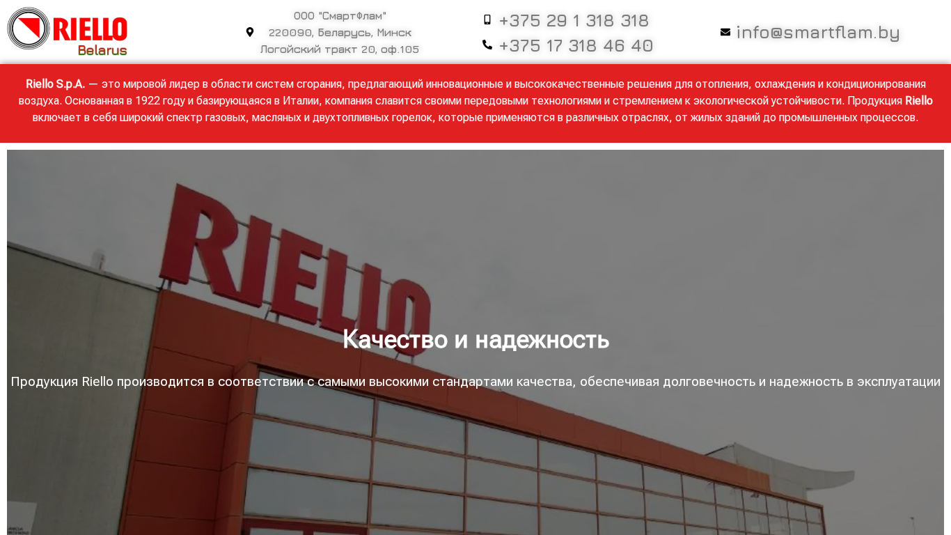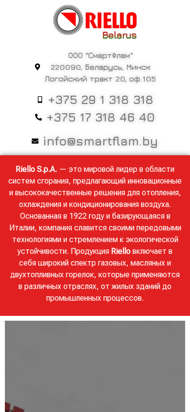 | AI-анализ | This website is the official supplier of Riello heating appliances and spare parts in Belarus, represented by OOO "SmartFlam". The company offers a wide range of Riello products, including gas, diesel, combined heaters and spare parts for heaters. Their specialists are ready to help you choose the appropriate equipment, ensure quick delivery and provide professional maintenance service. Trust the experience and quality - choose OOO "SmartFlam" as your Riello heating appliance supplier in Belarus. Riello S.p.A. is a global leader in the field of combustion systems, offering innovative and high-quality solutions for heating, cooling and air conditioning. Founded in 1922 and based in Italy, the company is known for its advanced technologies and commitment to environmental sustainability. Riello's product range includes a wide spectrum of gas, oil and |