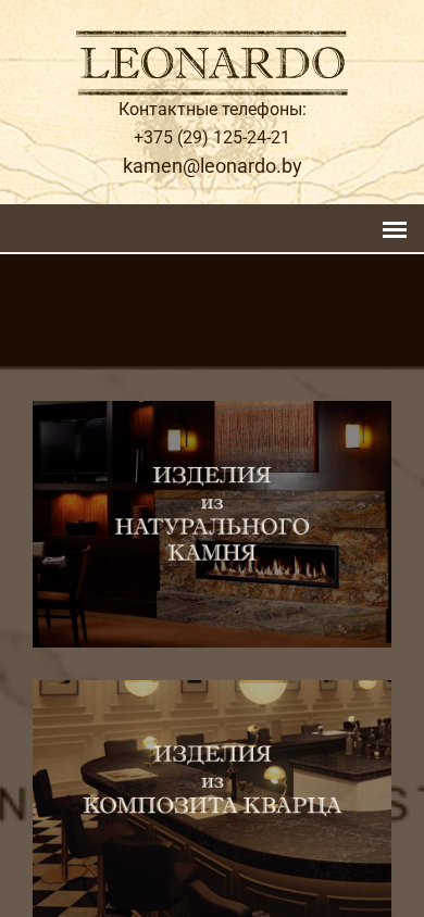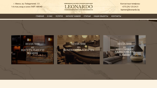 | AI-анализ | --- The web project "Leonardo" is a stone fireplace manufacturer based in Minsk, Belarus. The company specializes in producing fireplaces from various types of stone: natural stone, composite quartz, and artificial acrylic stone. Founded in 2009, Leonardo is the first company in Belarus to offer such a wide range of stone products. Direct imports of materials allow for quick turnaround times and extensive color options for customers. Leonardo assists clients in selecting the optimal stone type for their project based on its properties, characteristics, and cost. The company also offers additional services from design project development to installation on the client's site. Leonardo is a supplier of natural stone, including marble, granite, onyx, and travertine, as well as a supplier of composite quartz and artificial acrylic stone. The company's director, Yev |