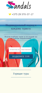 The web project Sandals.by functions as a travel guide in the world of journeys. Users can contact the website via two phone numbers to make a call and inquire about individual tours. The site offers an individual approach to each tourist and provides a selection of tours based on the latest trends in popular destinations. Hot tours include Egypt, India, Thailand, the UAE, Sri Lanka, Vietnam, Turkey, Greece, Montenegro, Cuba, the Dominican Republic, Bulgaria, Spain, Cyprus, the Maldives, and more. Each tour includes round-trip airfare, accommodation and meals, airport transfer with a Russian-speaking guide, and travel insurance as a gift. Sandals.by works directly with 75 tour operators to ensure the best prices for customers. The office is located in Minsk, Belarus, and is open daily from 10:00