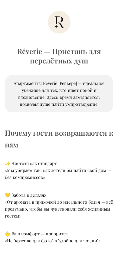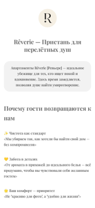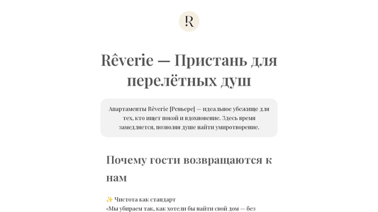 | AI-анализ | This online resource, titled "Rêverie — Пристань для перелётных душ — 𝐑✦," is a website dedicated to offering apartments for rent in the city of Grodno, Belarus. The website provides detailed information about various apartments located on different streets, including their sizes, number of rooms, and available amenities such as a washing machine, internet, and Wi-Fi. The apartments range from 40 to 70 square meters in size and offer one to three bedrooms. Some apartments also include a balcony or a view of the city. The website also includes a reservation system, allowing users to book their preferred apartment for a set price per day, with prices ranging from 150 to 220 BYN. The website's title translates to "Rêverie — A Shelter for Wandering Souls," suggesting a peaceful |