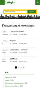 | AI-анализ | The web project Listing.by serves as the most comprehensive and up-to-date electronic directory for all businesses and companies in Belarus. It offers extensive information including contacts, addresses, descriptions, and reviews for various organizations. The site features a 'Add Business' menu and an 'Oбратная связь' (Contact Us) menu for user interaction, alongside a 'Войти' (Login) function. The homepage displays popular companies such as Oleg Peypalovich, Faraon, BelEirKom / Clime.by, KZ Minsk, and 1 2 3 4 B2B, among others. The site categorizes businesses into numerous sectors including auditing, banking equipment, business registration, consulting services, conference halls, and more, with a total of 54 categories. Companies in the 'Полиграфия, издательства' |