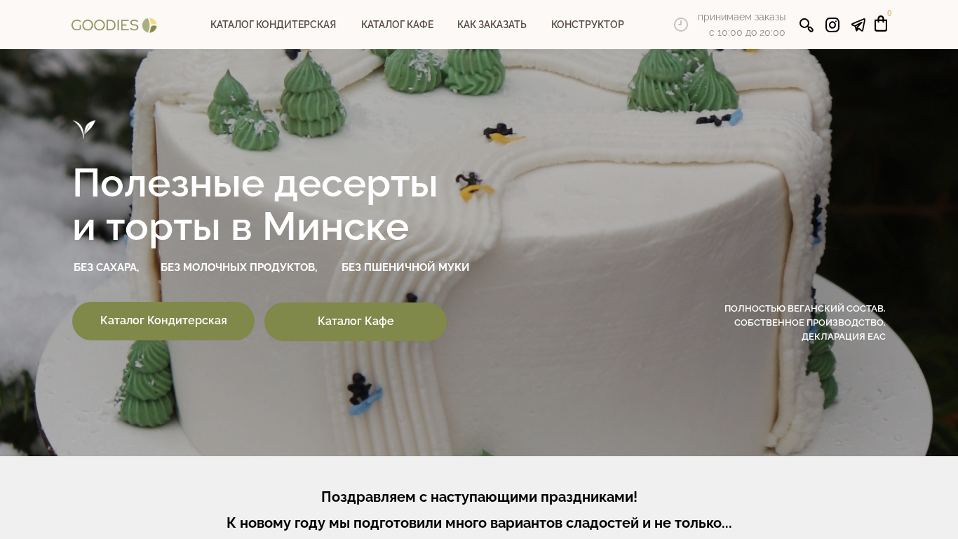 | SEO-описание | Полезные веган десерты и торты Goodies в Минске. Доставка, самовывоз. Без сахара, пшеничной муки и молочных продуктов. |