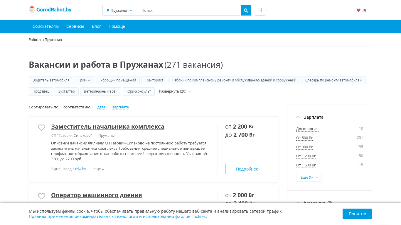 | SEO-описание | Ищете работу в Пружанах? На нашем сайте Вы найдете более 271 свежей вакансии от прямых работодателей. Быстрый и удобный поиск вакансий с ГородРабот.бай |