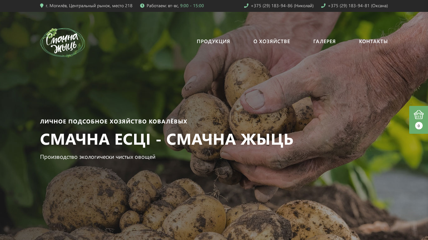 | AI-анализ | This website is for an ecologically clean vegetable production named 'Смачна жыць' (Smachna žyć) located in Moгилёв, Central Market, place 218. The farm operates from Tuesday to Sunday, 9:00 - 15:00. The contact numbers for Nicolas and Oxana are +375 (29) 183-94-86 and +375 (29) 183-94-81, respectively. The website offers various vegetables such as young potatoes, cabbage, cucumbers, apples, pears, onions, eggplants, and sells them by weight. The prices are listed for each vegetable, and the site mentions free delivery to Moгилёv with orders over 30 rubles. The farm is located in the village of |