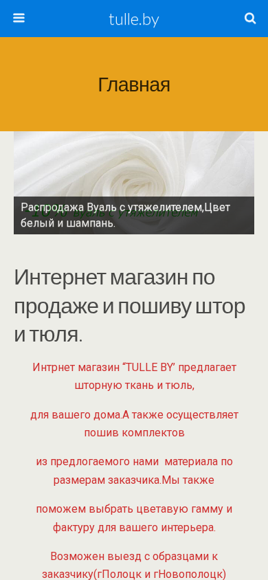 | AI-анализ | The website is an e-commerce platform specializing in the sale and custom-made production of curtains and tulle for homes. Tulle.by offers a range of curtain fabrics and tulles, with options for customers to purchase ready-made curtains or have custom-made sets according to their preferences. The website also provides assistance in selecting the appropriate color palette and fabric texture for interior decoration. Delivery is available within Belarus via postal service or local courier. The website features ongoing sales on various curtain fabrics and tulles, with price reductions displayed for each item. Available fabric options include canvas, roгожка (a type of fabric), софт (soft fabric), бархат (velvet), жакард (jacquard), and various tulle types. Examples of available designs and colors can be found on the website, and customers can log |