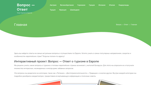 | AI-анализ | This online resource, titled "Вопрос — Ответ — Тема Туризм в Европе" (Question-Answer-Topic Tourism in Europe), is a website dedicated to providing answers to frequently asked questions about traveling in Europe. Users can explore categories such as "Food," "Attractions," "Traditions," and more, each with detailed information and helpful tips. The website features menus for popular European countries including Austria, Britain, Germany, Greece, Ispana, Italy, Netherlands, Türkiye, France, and Switzerland. The site aims to provide information on the culture, traditions, and attractions of each country, as well as practical advice for planning trips and discovering hidden gems. European destinations offer a rich blend of history, culture, and contemporary trends, with each city and village hiding unique stories and experiences waiting to be discovered. From the romantic streets of Paris to |
