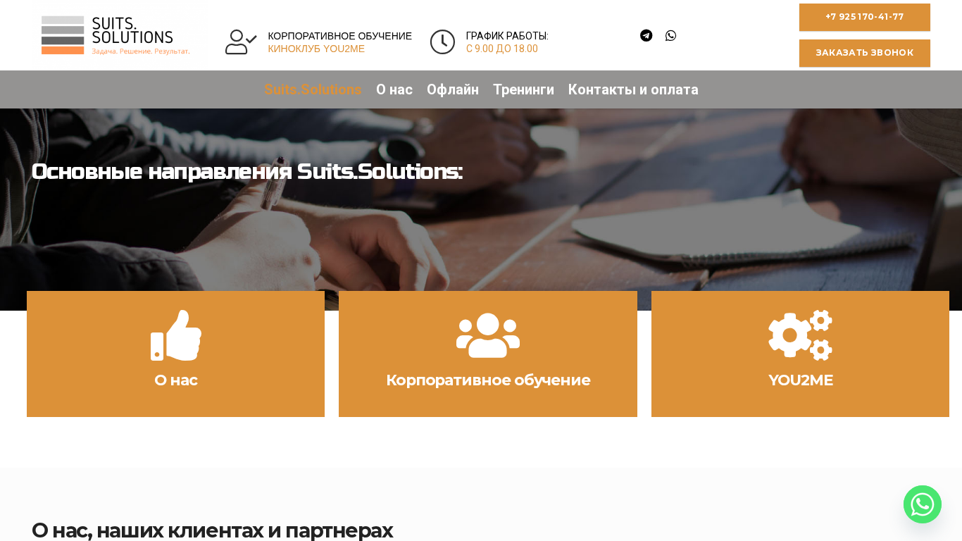 | SEO-описание | Suits.Solutions - это открытые, выездные и online тренинги для корпоративных заказчиков "под ключ". Авторский "Клуб для любопытных YOU2ME". |