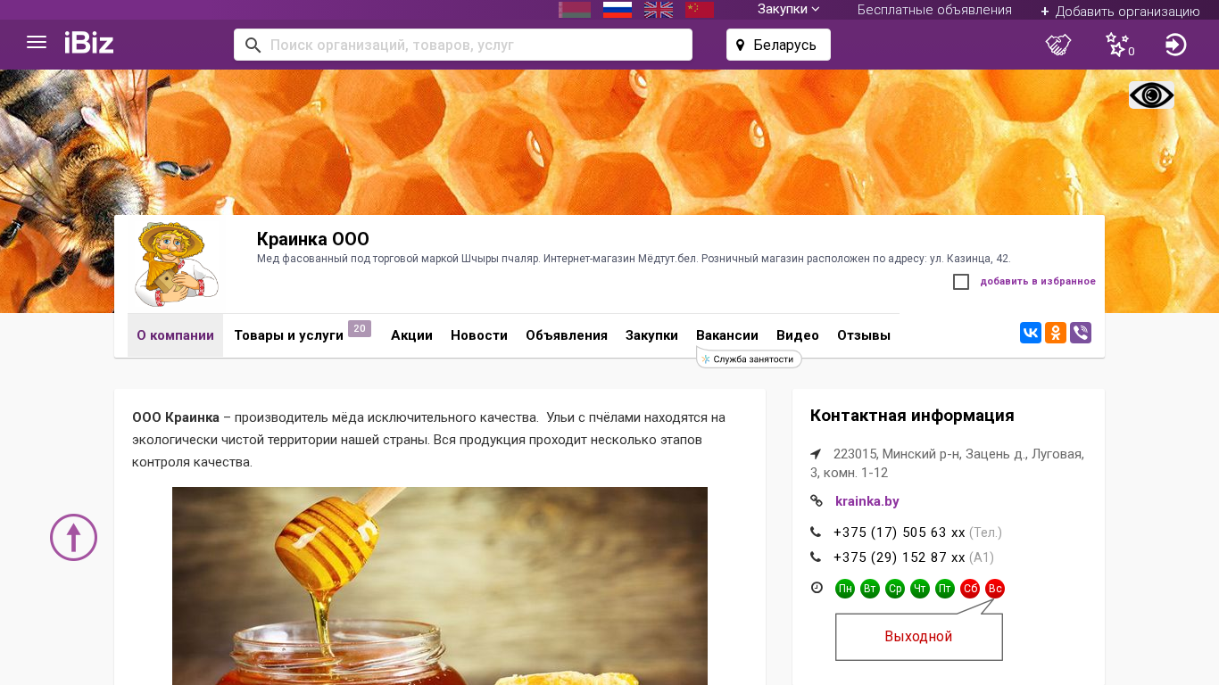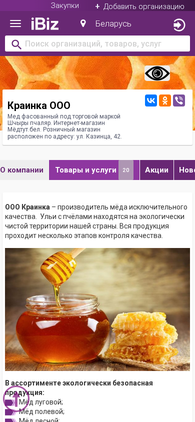 | AI-анализ | --- This online resource is a retail business named Краинка OОO - Мед фасованный под торговой маркой Шчыры пчаляр, operating an e-commerce storefront named Мёдтут.бел. The physical store is located at ул. Казинца, 42, in the city of Минский р-н, Зацень д., Луговая, 3, комн. 1-12. The business deals with the production and sale of honey, with a focus on eco-friendly and high-quality offerings. The product range includes various types of honey, such as meadowsweet, clover, forest, and gourmet honey. The website offers a 'cold filtering' process to maintain the honey's beneficial properties. Customers can benefit from delivery services and special discounts for regular clients. The |