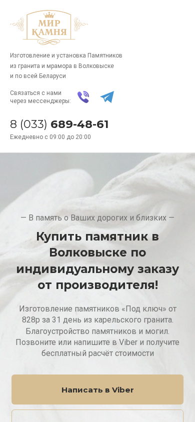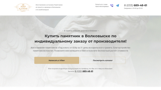 | AI-анализ | This website offers the purchase of a monument in Volkovysk from Mir Kamnya with manufacturing and installation within 31 days at the producer's price. The company specializes in the production and installation of granite and marble monuments in Volkovysk and throughout Belarus. Customers can contact the company through messengers at 8 (033) 689-48-61 for a free quote and consultation, or view the catalog. The website provides a range of granite types from affordable to exclusive models, with a focus on durable and long-lasting natural granite from Carelia. Services include the production of monuments "turnkey" starting from 828 Belarusian rubles, as well as the improvement and maintenance of monuments and graves. The website offers a full package of documents upon ordering, with official guarantees and contracts. Monuments can be made |