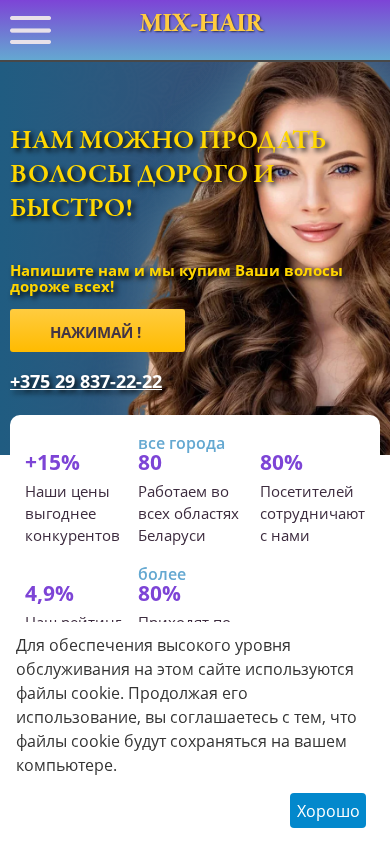 | SEO-описание | Компания "МиксХаир" предлагает продать волосы натуральные, крашеные, седые, детские, срезанные от 40 см оперативно. Скупка по ценам выше, чем у конкурентов. Выезд мастера на дом по всем городам и регионам Беларуси. Узнать стоимость волос можно по телефону +375 29 837-22-22 или оставив заявку на сайте mixhair.by |