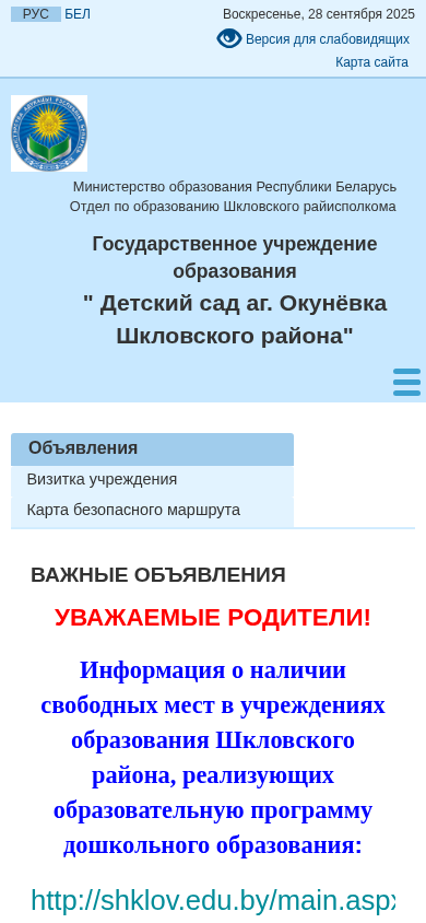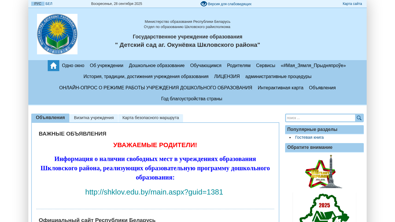 | Название / Заголовок | Детский сад аг. Окунёвка Шкловского района |