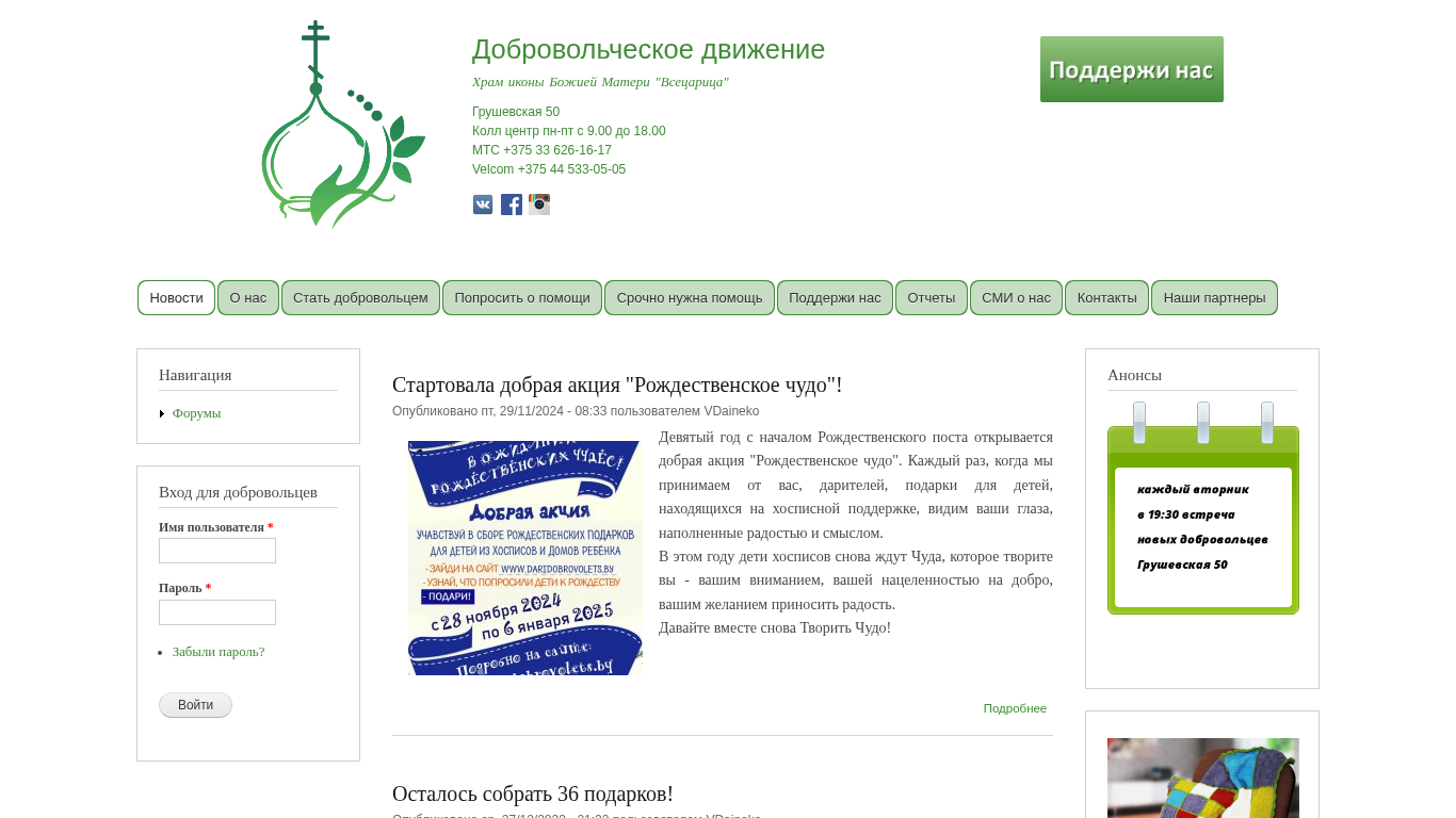 | AI-анализ | This website is for a charitable organization named "Добровольческое движение" (Volunteer Movement) associated with the Church of the Icon of the Mother of God "Всецарица" (All-Sovereign). The site provides information on ongoing charity initiatives, including a "Рождественское чудо" (Christmas Miracle) campaign which aims to collect gifts for children in hospices. The site includes a call-to-action to participate in the campaign and details on how to donate. The site also features news, contact information for the organization, and information on their partners. The current focus of the site is on the Christmas Miracle campaign, which started on November 29, 2024, and aims to collect 36 gifts for children in need. The site was last updated on December 14, 2023. |