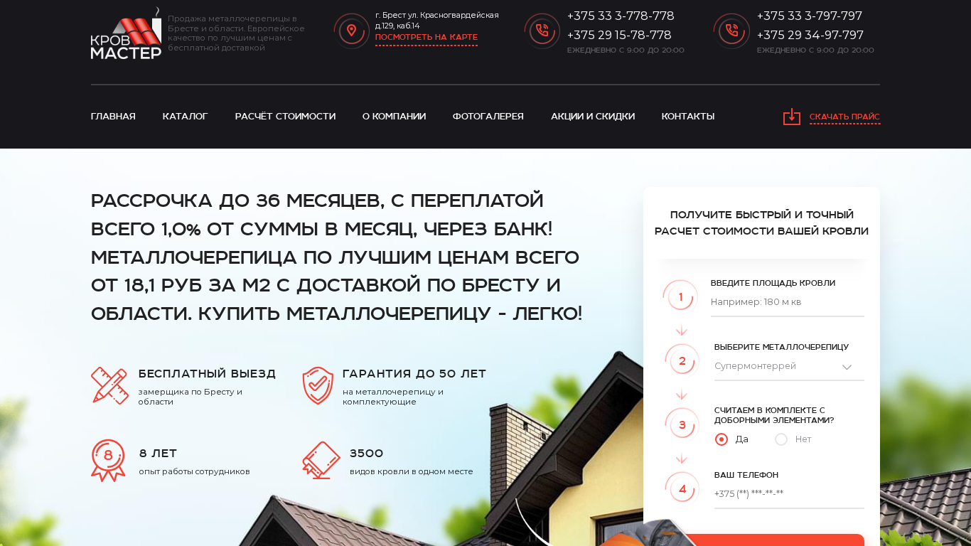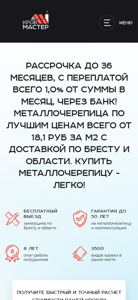 | AI-анализ | --- The web project "Krovmaster.by" is an e-commerce website for selling metal roofing in Brest, Belarus. It offers European quality metal roofing at competitive prices with free home delivery. The company provides a 36-month installment plan with a 1.0% interest rate per month through a bank. The site includes a catalog with photos, prices, and contact information, as well as a calculator to estimate roofing costs. The company claims to have 3500 types of roofing in one place and provides a free site inspection. The site is available at krovmaster.by. |