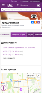 | AI-анализ | The web project "Delo-Grupl UP" specializes in supplying equipment for security systems, located in Minsk, Belarus, at the address Одоевского, 101 А, office 445. The website provides contact information, including two phone numbers, +375 (17) 270 62 xx and +375 (29) 377 80 xx. The company's Unified State Register number is 190444173. The website features a map for directions and business hours from Monday to Saturday, 9:00 AM to 6:00 PM without lunch breaks. The company is listed under the categories "Security and Protection" and "Security and Protection in Minsk" on the Yandex Business Directory. |