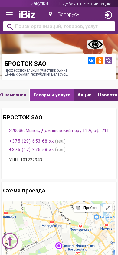 | Название / Заголовок | БРОСТОК ЗАО - Профессиональный участник рынка ценных бумаг Республики Беларусь. . 220036, Минск, , Домашевский пер., 11 А, оф. 711 |