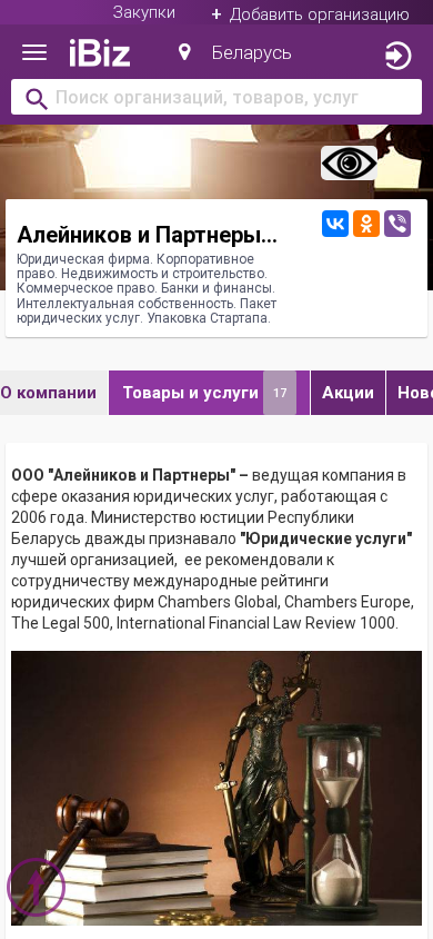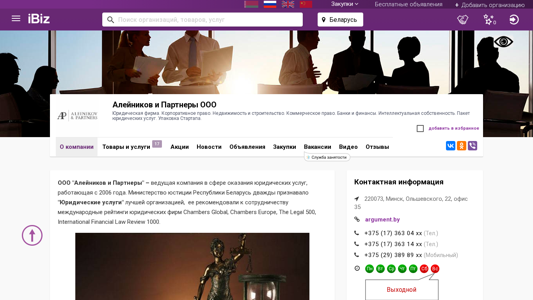 | AI-анализ | The portal Argument.ibiz.by is a legal firm, providing a range of legal services including corporate law, real estate and construction, commercial law, banking and finance, intellectual property, and a package of legal services for startups. The company, Aleynikov and Partners OOO, is located in Minsk, Belarus, at Olshevskogo 22, office 35. The organization also offers free classified ads for procurement and has been recognized as a top legal firm by the Ministry of Justice of the Republic of Belarus and international legal rankings such as Chambers Global, Chambers Europe, The Legal 500, and International Financial Law Review 1000. Major clients include Wargaming, British-American Tobacco, Microsoft, McDonald's, HEINEKEN, Tikkurila, China CAMC Engineering Co, Dana Holdings, |
