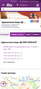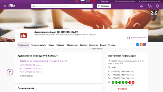 | AI-анализ | The website is for the law firm De Yure Consult located at Независимости пр-т, 11, корп. 2, комн. 306 in Minsk, Belarus. The firm offers legal, accounting, and appraisal services, as well as professional translations. The website includes a map for directions, contact telephone numbers, and the company's UNP number. Services offered include legal and accounting services, appraisals, and professional translations. The website also includes a section for job vacancies and company news. The contact details include phone numbers for three different numbers, and the company's UNP number is provided. The website is in the IBiz Media catalog under the Legal Services category, and also under Business Services. |