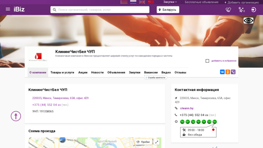 | Название / Заголовок | КлинингЧистБел ЧУП - Клининговая компания в Минске предоставляет широкий спектр услуг по наведению порядка и чистоты.. 220035, Минск, , Тимирязева, 65А, офис 429 |