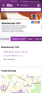| AI-анализ | The portal MovаЕксперт ООО offers translation services for both physical and legal entities. It provides voice translation, IT translation, artistic translation, apostille and document legalization, and medical translation. The contact information, location scheme, and phone numbers for the MovаЕксперт ООО company are provided. The website includes sections for company information, goods and services, news, job vacancies, videos, and user reviews. MovаЕксперt ООО is located at 220005, Minisk, Gikalo, 3, office 216. The phone number is +375 (44) 788 68 xx. The company's Unified State Registration Number (USTRN) is 193637515. The opening hours are from 9:00 to 18: |
