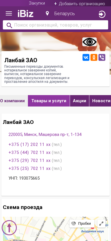 | AI-анализ | The portal Lanbay ZAO offers document translation services, notarial certification of copies and extracts, notarial certification of translations, consular legalization, and the affixing of apostilles on documents. The address and contact phone numbers for Lanbay ZAO are provided. The company is located in Minsk, Belarus, on Masherova pr-t, 1-134. Services include document translation, notarial certification, and consular legalization. Lanbay ZAO is in the category of translation services in Minsk, Belarus. |