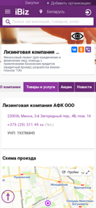 | AI-анализ | This website is a leasing company called АФК ООО - Финансовый лизинг, located in Минск, Belarus at 3-й Загородный пер., 4В, пом. 14. The company offers leasing services for both legal entities and individuals, as well as assistance in obtaining bank loans and credit brokering, and business plan development/TEO. The site includes sections for adding organizations, free classifieds for purchasing, contact information, and a map for reaching the company. The company's phone number is 311 49 xx and its UNP (unified taxpayer number) is 193786845. The website operates from Monday to Friday, 9:00 AM to 6:00 PM, except for weekends. It is listed under the category of leasing in the |