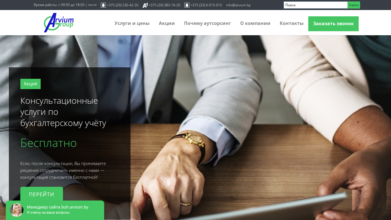 | SEO-описание | Предоставление бухгалтерских услуг для ИП или ООО от компании Арвиум Групп. Онлайн-калькулятор для расчета стоимости услуг. Бухгалтерское сопровождение организации. Заказ онлайн. Записаться на консультацию по телефону 8 (29) 230-42-35 |