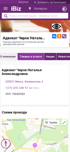 | AI-анализ | The portal is a legal services website for Natalia Alexandrovna Chyrok, an attorney based in Minsk, Belarus. The website provides assistance for criminal and civil cases, and includes a contact address at Filimonova 3, 220037, as well as a phone number +375 (29) 640 97 xx. The website features a contact form and a section for company information, as well as a map and traffic information. Office hours are specified as Monday to Friday from 9:00 to 18:00, without lunch breaks. The website is listed under the categories 'Attorneys' and 'Attorneys in Minsk'. |