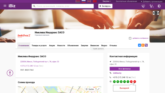 | AI-анализ | The web project Imkliva Inshurans ZASO is a Belarusian insurance company located at 220004, Minsk, Pobeditelev Prospekt, 7A, office 33. The website provides contact information and a map for visitors. The company's phone number is +375 (17) 240 12 xx. The project is classified under the categories of Insurance Companies and Companies in Minsk. The company's business hours are from 8:30 AM to 5:15 PM, Monday through Friday, with a break for lunch. The website includes sections for news, vacancies, and customer reviews on social media platforms such as VKontakte and Odnoklassniki. Users can also contact the company via Viber. The website is operated by OOO "AIBIZ Media |